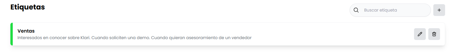 Las Etiquetas son categorías que podemos crear para que Klari clasifique los chats del CRM según el contenido de las conversaciones.